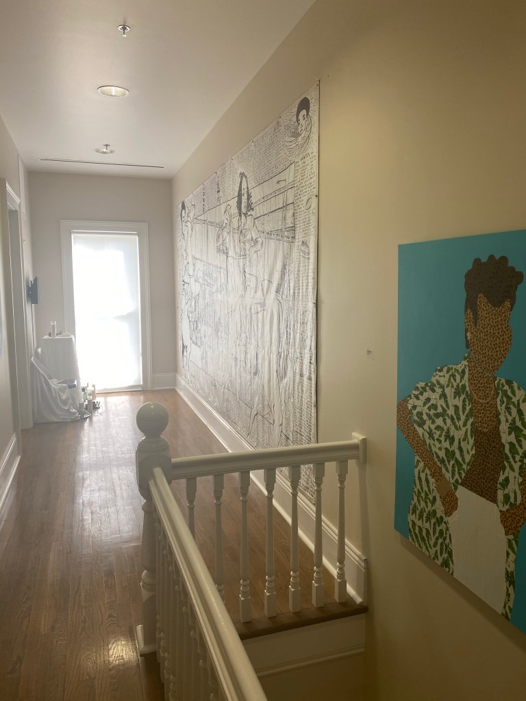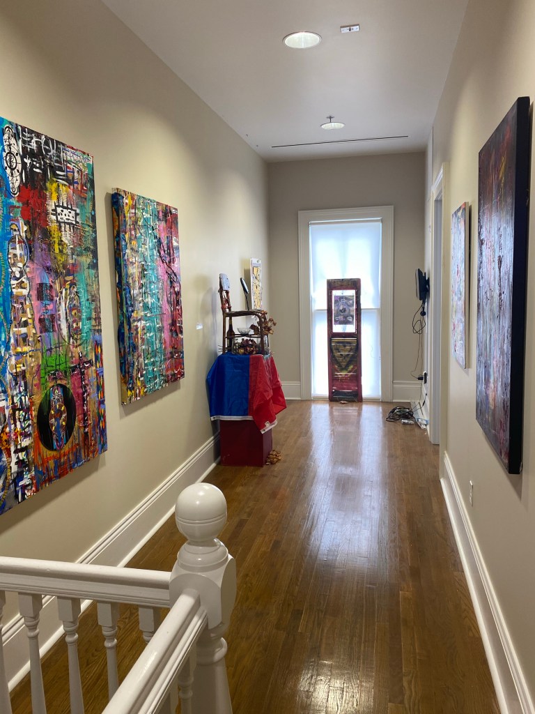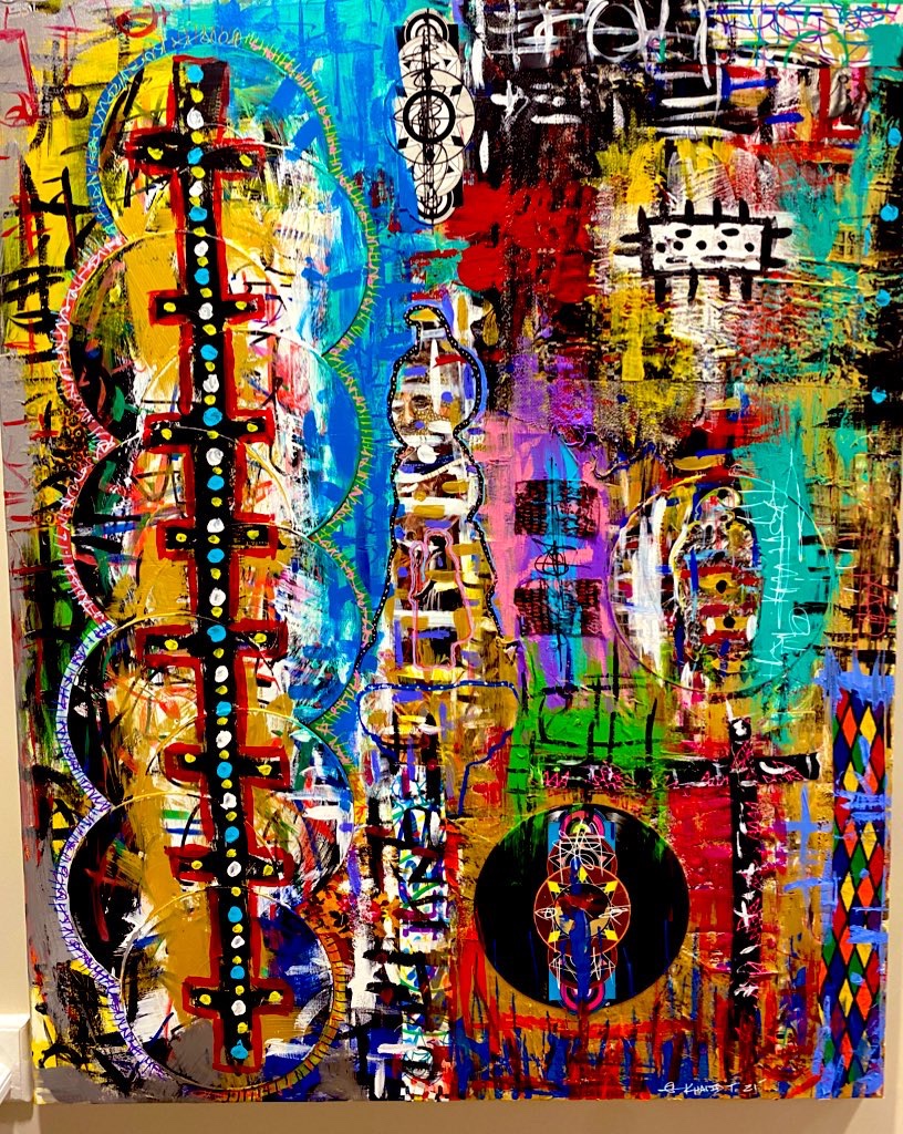 Langston Alston’s large-scale intricate work evokes the life and spirit of the city, animating and representing the physical embodiment of the work of the altars. Note the presence of archangels throughout his piece.