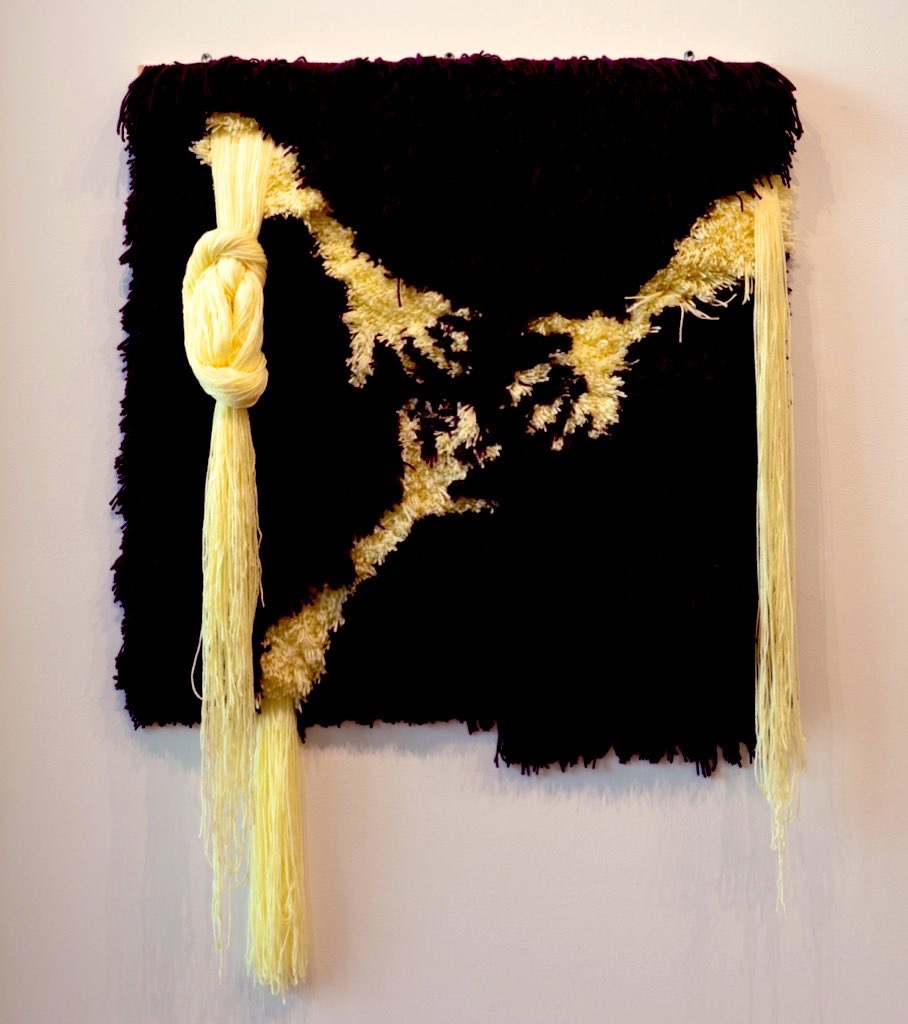“My work addresses a serious need for the representation of black and brown bodies translated into text and imagery and then used within textile-based work, such as weavings, latch hook, prints, and tufted pieces. The text utilized within my work is taken from conversations between myself and those dear to me being their most true selves who may be caught mid-laugh or in a captured playful pose.”