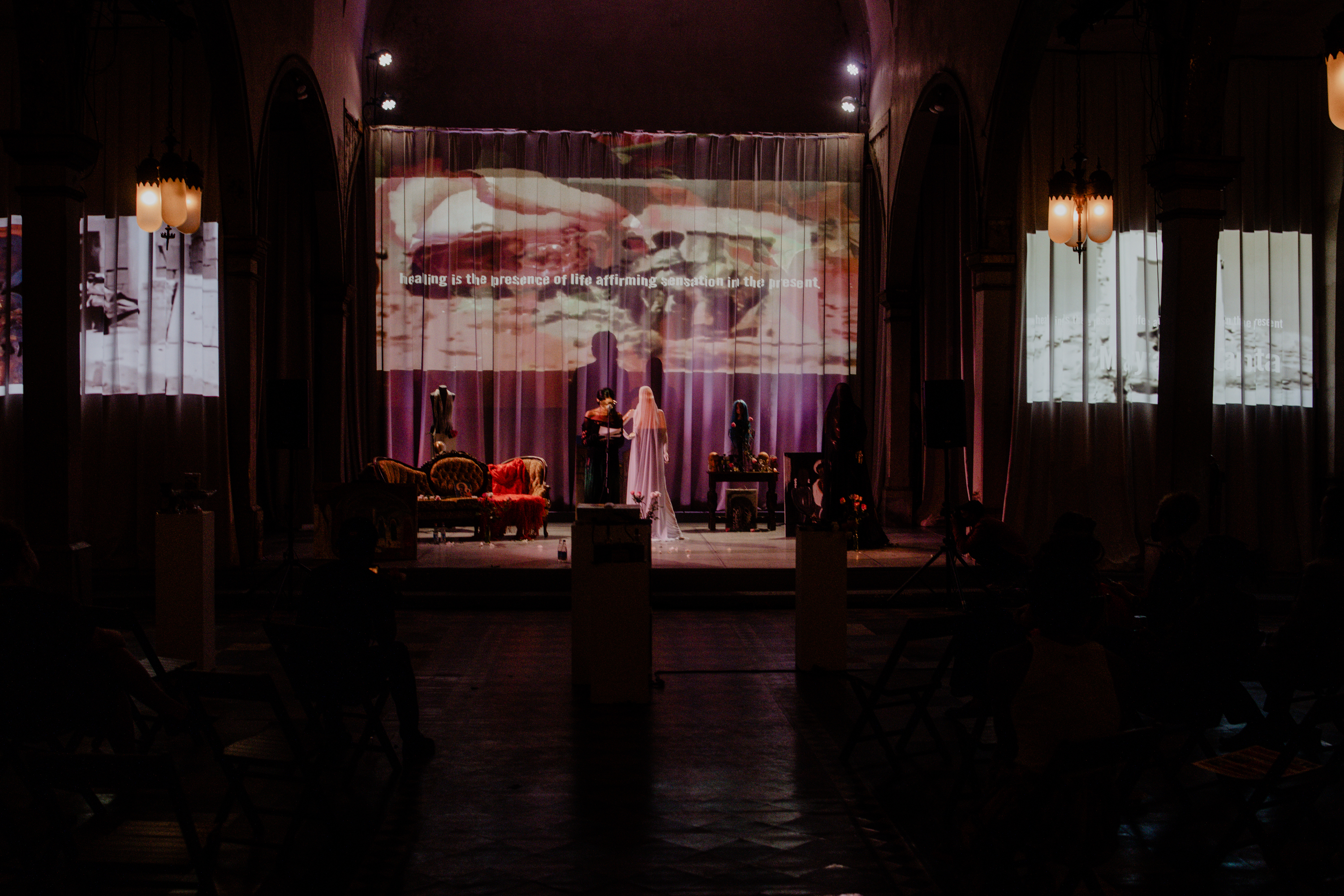 Temple of Color and Sound is an itinerant gathering, ritual, and contemplative performance space. A place for spiritual and intellectual refuge and recreation; its proprietor, Maryam de Capita is an artist, mystic, and entertainer from Republica, a free Black republic on the Gulf Coast of North America. With its capital located at the mouth of the Mississippi River, Republica has played an important role in the struggle for Black autonomy in the Western Hemisphere by using sound as its primary organizing principle and revolutionary strategy. Amid ever present natural and man-made threats to the security and autonomy of all the people of the Gulf Coast, Maryam presents her philosophy about the use of objects, text, and the chops and loops of original, popular and sacred music as self actualizing modalities and vehicles toward collective liberation.